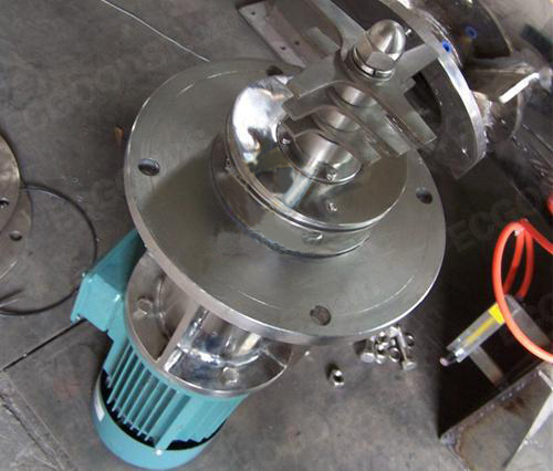高速飛刀安裝于犁刀混合機(jī)筒側(cè)向下45度角,刀頭伸入筒內(nèi),在攪拌時(shí),物料受犁刀驅(qū)趕至飛刀有效范圍,受飛刀高速剪切。